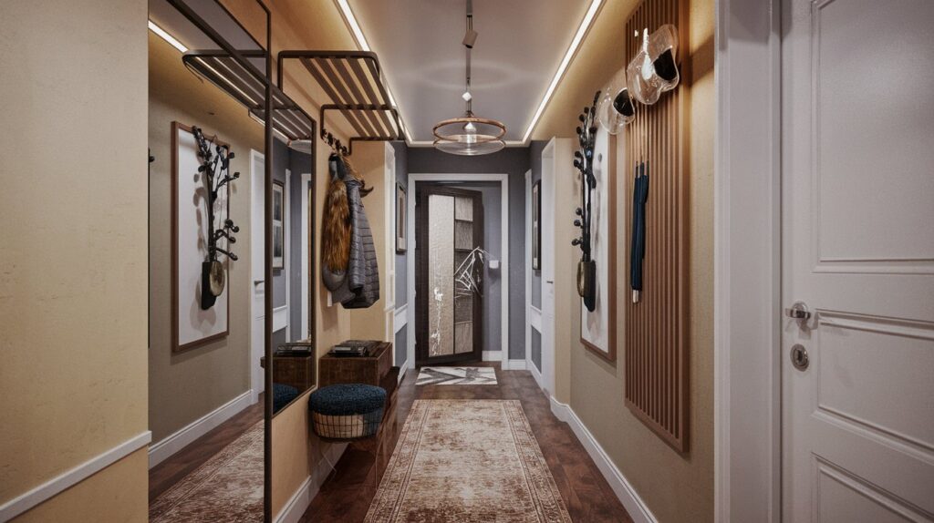 Este important să păstrezi unitatea cromatică: nu combina mai mult de două-trei culori principale într-un hol foarte îngust. Astfel, spațiul nu va părea fragmentat, iar privirea va percepe o atmosferă coerentă și relaxantă.
