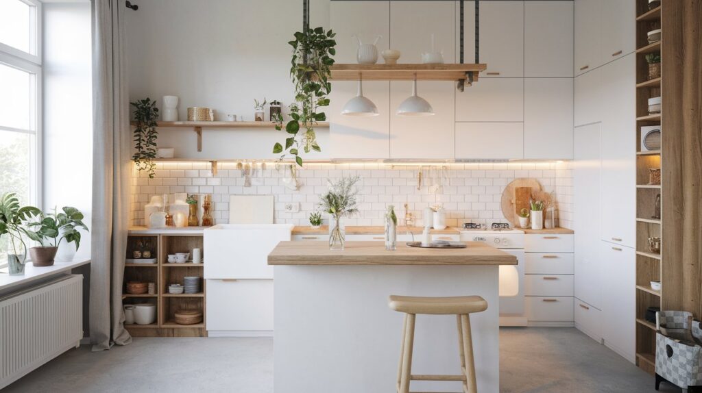 Stilul scandinav este renumit pentru modul în care maximizează spațiile mici, transformându-le în încăperi luminoase, aerisite și pline de căldură. Chiar și cea mai modestă bucătărie poate deveni un refugiu primitor atunci când este amenajată inteligent, cu accent pe funcționalitate și simplitate. Primul pas este să te concentrezi pe optimizarea spațiului vertical. Montează rafturi deschise pe pereți înalți pentru a depozita vasele sau condimentele, lăsând blatul liber și curat.